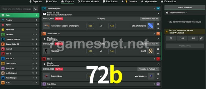 O 72b oferece uma grande seleção de opções de apostas em e-sports com probabilidades competitivas